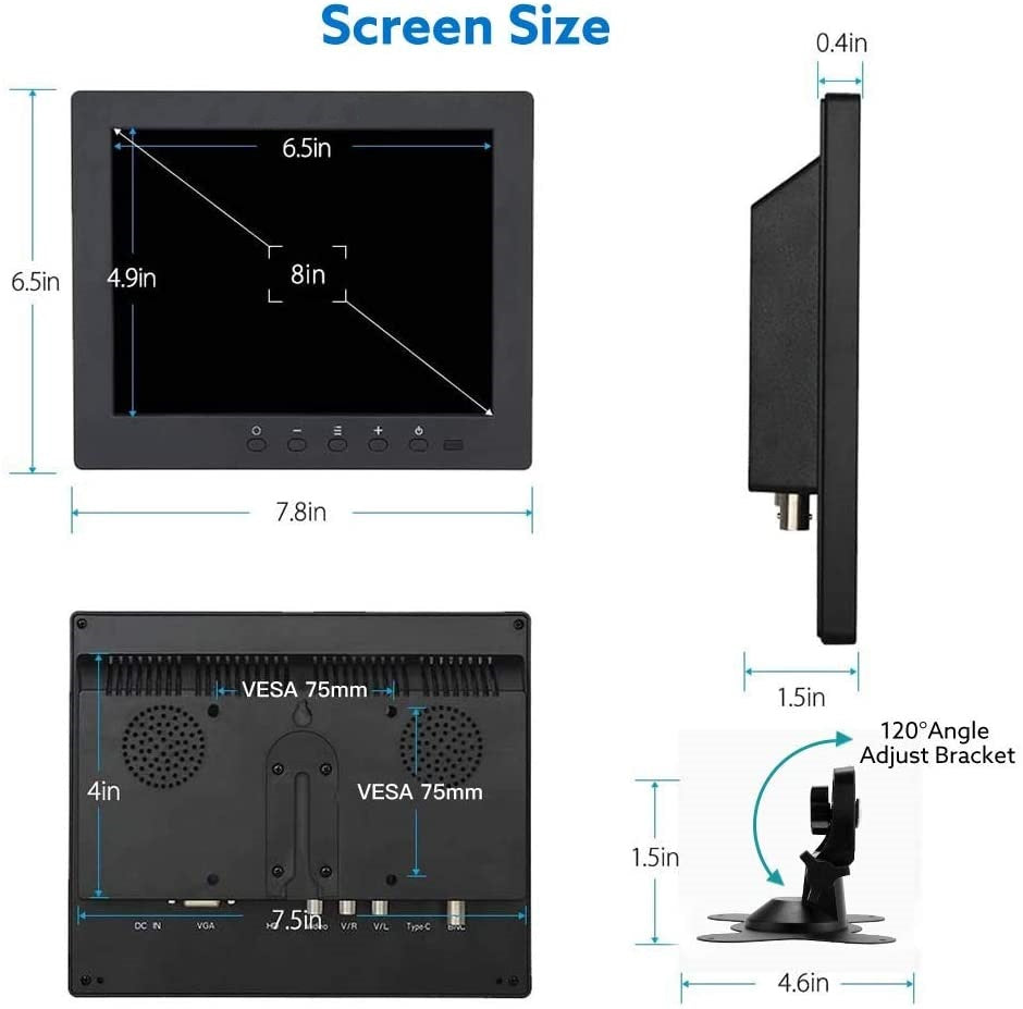 8 inch LCD Color Monitor Composite Video with BNC & 1024 X 768 (720 HD) HDMI, 12VDC